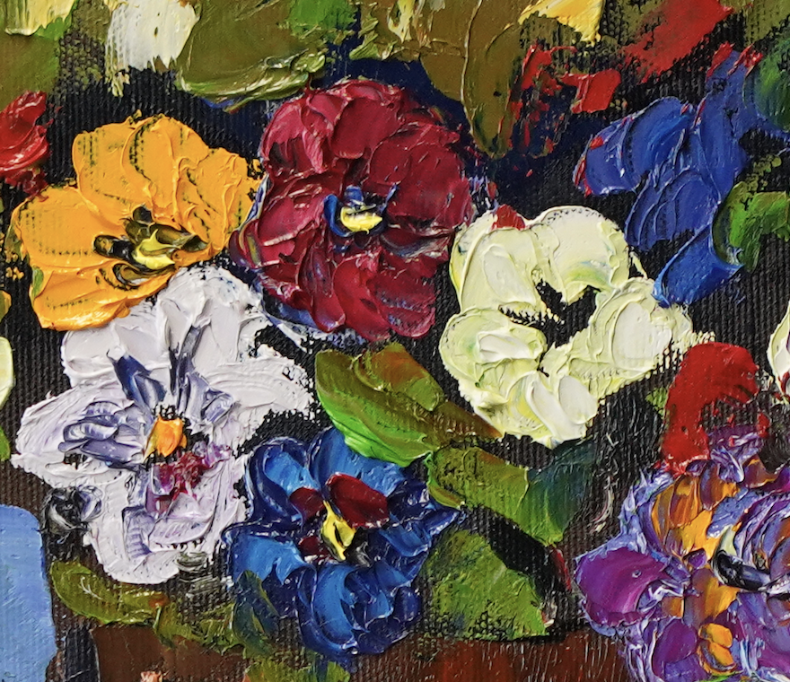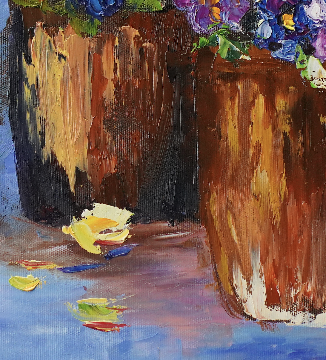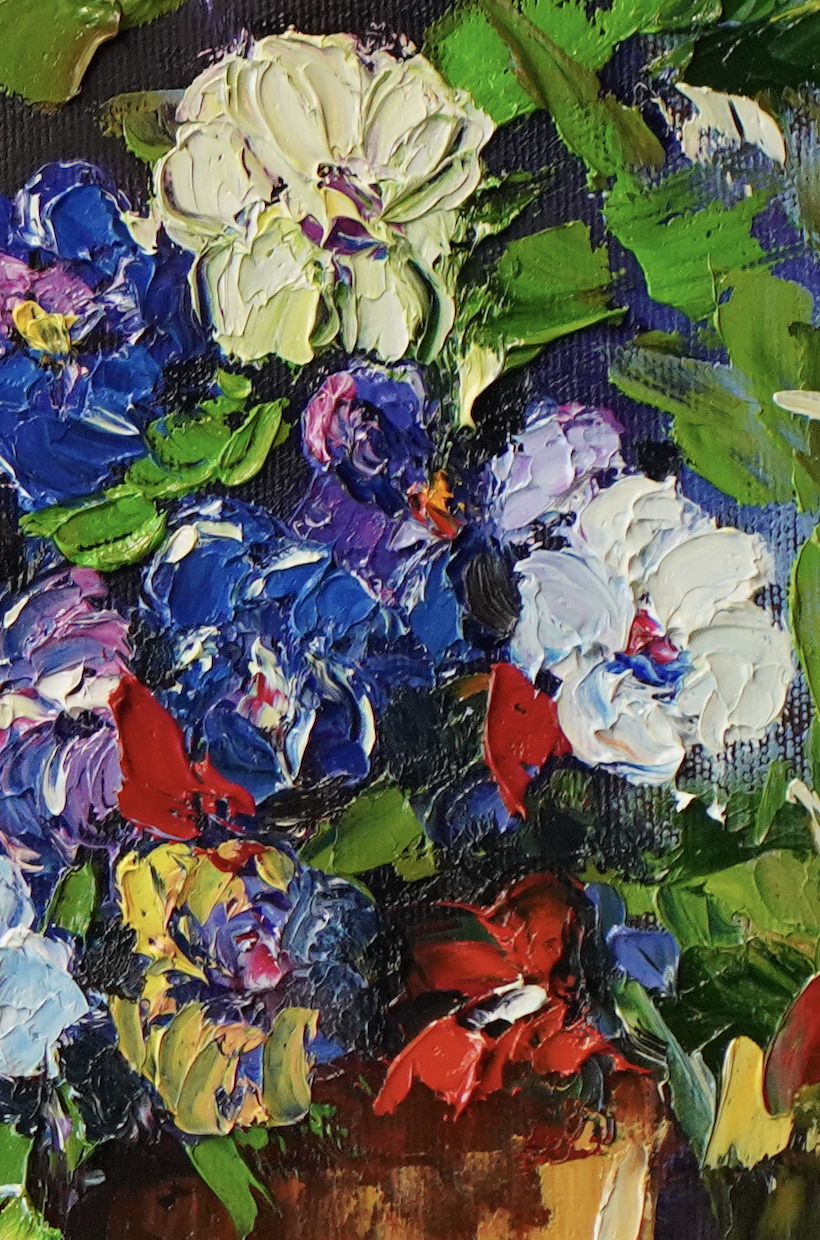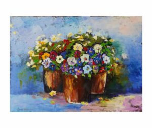„Dawno temu 5” to nie tylko obraz, to wizualna podróż do ogrodu pełnego życia. Zastosowana technika olejna pozwoliła mi na stworzenie dzieła o bogatej fakturze i dynamicznych warstwach koloru. Kompozycja skupia się na trzech donicach, z których bujnie wylewają się różnobarwne kwiaty. Malowane techniką impasto, płatki kwiatów są wyczuwalne, nadając im niemal rzeźbiarską formę. Widoczne są intensywne odcienie fioletów, błękitów, bieli, żółci i czerwieni, które przenikają się, tworząc płynne przejścia i głębokie cienie, nadające kompozycji wrażenie obfitości i naturalności. Tło obrazu, utrzymane w odcieniach błękitu i szarości z dynamicznymi pociągnięciami pędzla, podkreśla głębię pierwszego planu i dodaje scenie atmosfery. Każde pociągnięcie pędzla jest precyzyjnie przemyślane, a jednocześnie zachowuje spontaniczność, co jest kluczowe w malarstwie oddającym piękno natury. Obraz jest wykończony specjalnym werniksem, który chroni kolory przed blaknięciem i nadaje im subtelny, satynowy blask, podnoszący jego estetyczną wartość.