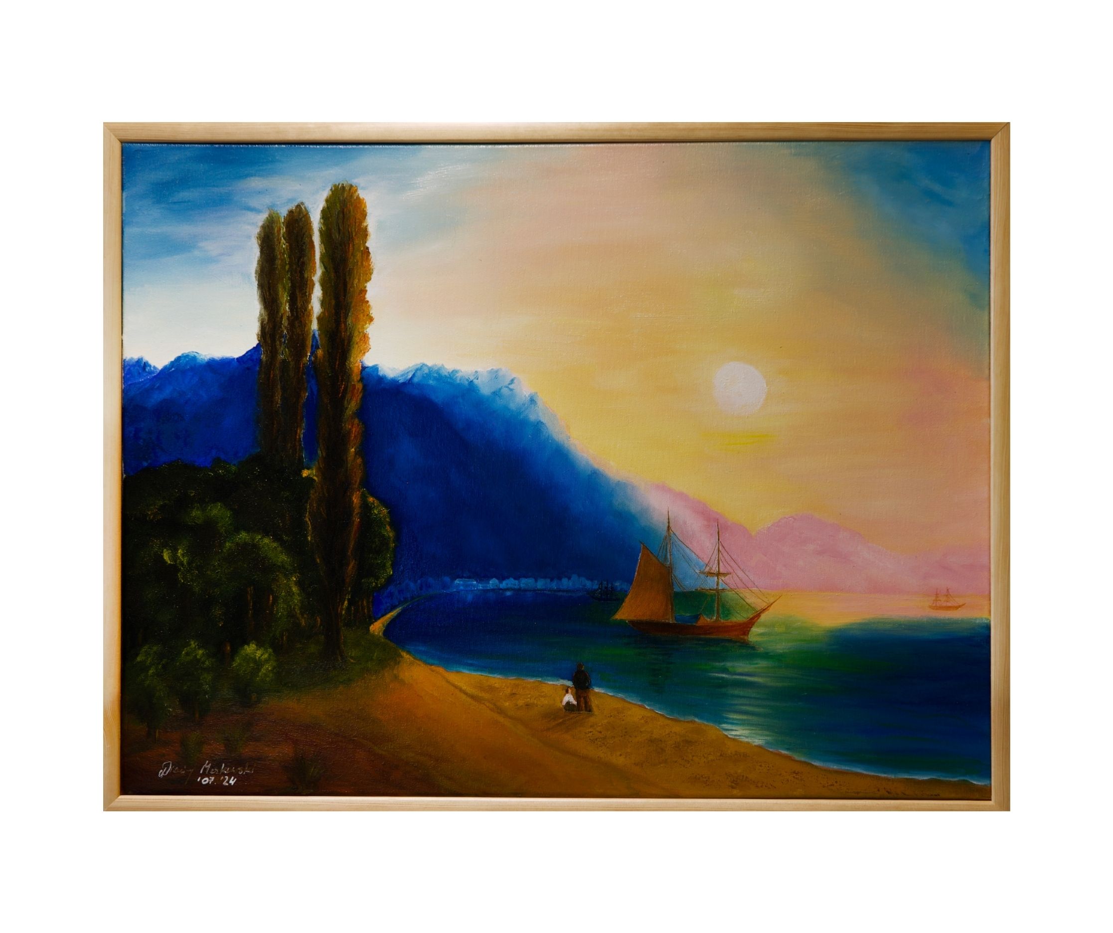 „Nierealne marzenie” to nie tylko obraz, to wizualna podróż do krainy, gdzie słońce chyli się ku zachodowi lub wschodzi, malując niebo pastelowymi barwami. Zastosowana technika olejna pozwoliła mi na stworzenie dzieła o bogatej fakturze i delikatnych, przenikających się warstwach koloru. Kompozycja przedstawia malowniczy pejzaż morski lub jeziorny z wybrzeżem na pierwszym planie. Po lewej stronie dominują wysokie, smukłe drzewa o pomarańczowo-brązowych koronach, stojące na tle majestatycznych, błękitno-fioletowych gór. Ich kształty, choć realistyczne, nabierają nieco onirycznego charakteru. Po prawej stronie, na tafli spokojnej wody, unosi się stylizowany statek z czerwonymi żaglami, płynący w stronę jasnego słońca lub księżyca. Dwa małe, ciemne punkty na brzegu, sugerujące ludzkie sylwetki, dodają scenie intymności i poczucia obecności. Niebo mieni się odcieniami pomarańczy, żółci, różu i błękitu, tworząc atmosferę spokoju i marzycielskości. Każde pociągnięcie pędzla jest precyzyjnie przemyślane, a jednocześnie zachowuje spontaniczność, co jest kluczowe w malarstwie, które ma oddać niewerbalne narracje i stany emocjonalne. Obraz jest wykończony specjalnym werniksem, który chroni kolory przed blaknięciem i nadaje im subtelny, satynowy blask, podnoszący jego estetyczną wartość.
