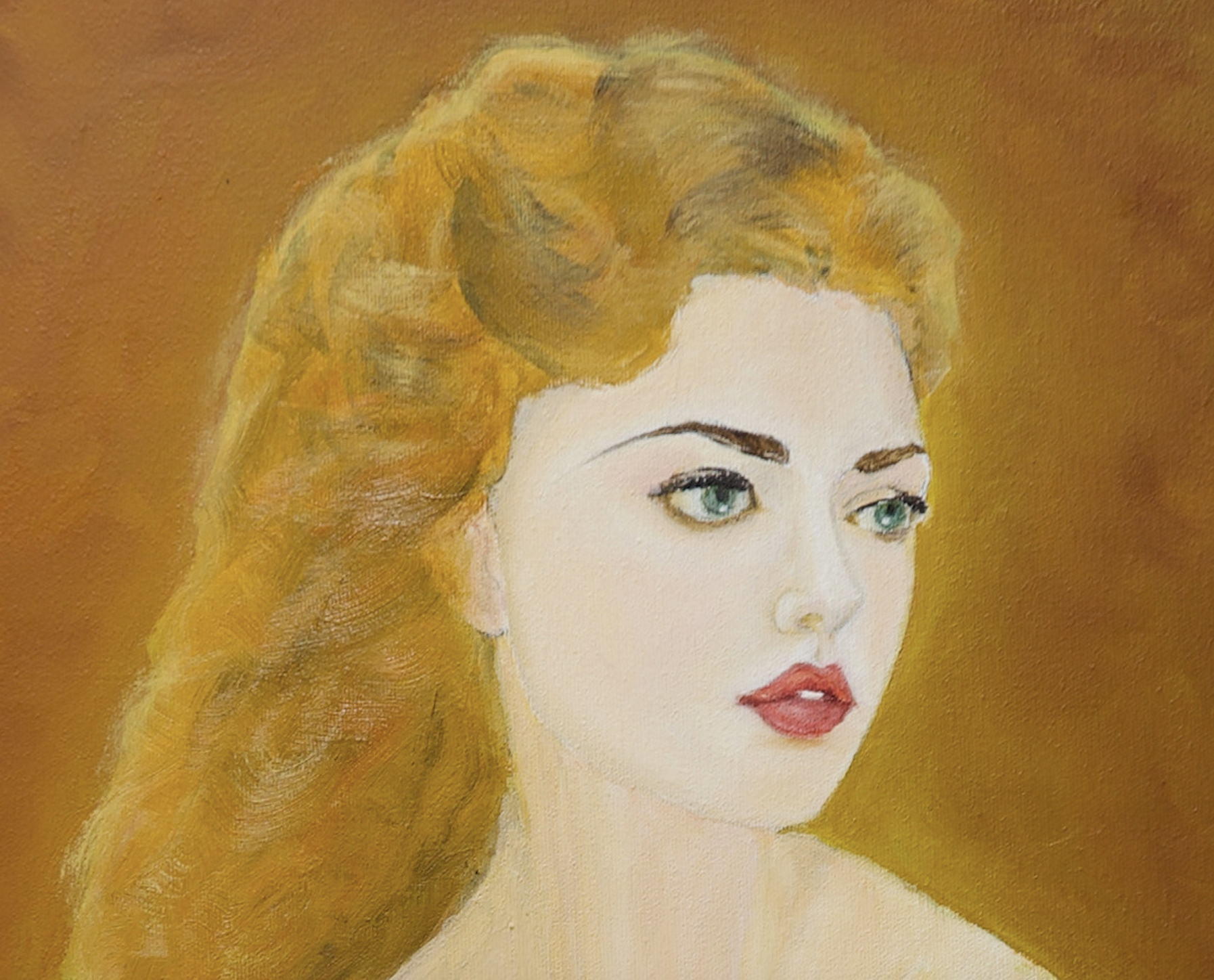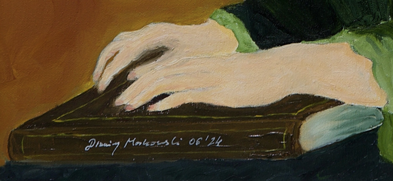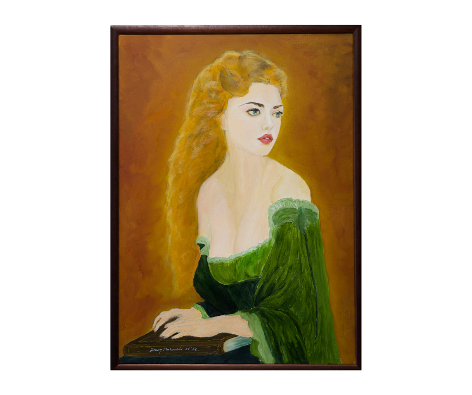 „Poe’me Ofelia” to nie tylko obraz, to wizualna opowieść, która narodziła się z moich rozważań nad postacią Ofelii, być może jako symbolu wrażliwości i wewnętrznego świata. Zastosowana technika olejna pozwoliła mi na stworzenie dzieła o bogatej fakturze i delikatnych, przenikających się warstwach koloru. Kompozycja przedstawia portret kobiety w ujęciu do bioder, odwróconej lekko na prawo, z twarzą zwróconą w lewo, co nadaje jej spojrzeniu głębi i refleksyjności. Jej długie, falujące włosy w odcieniach złocisto-rudych spływają swobodnie, tworząc malowniczy element. Usta malują się intensywną czerwienią, a oczy, szeroko otwarte, zdają się patrzeć w dal z nutą zamyślenia lub smutku. Kobieta ubrana jest w suknię w głębokim, szmaragdowym odcieniu zieleni, z ozdobnymi, bufiasymi rękawami i dekoltem, co nawiązuje do stylistyki renesansowej lub romantycznej. Jej dłonie spoczywają na ciemnym przedmiocie, przypominającym księgę lub szkatułę, co może sugerować poszukiwanie wiedzy, skrywaną tajemnicę lub wspomnienia. Tło obrazu jest stonowane, w ciepłych odcieniach brązu i ochry, co skupia uwagę na postaci. Każde pociągnięcie pędzla jest precyzyjnie przemyślane, a jednocześnie zachowuje spontaniczność, co jest kluczowe w malarstwie portretowym oddającym charakter i emocje. Obraz jest wykończony specjalnym werniksem, który chroni kolory przed blaknięciem i nadaje im subtelny, satynowy blask, podnoszący jego estetyczną wartość.