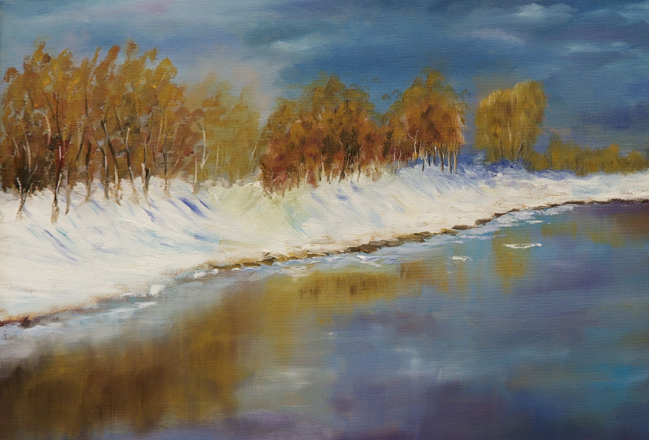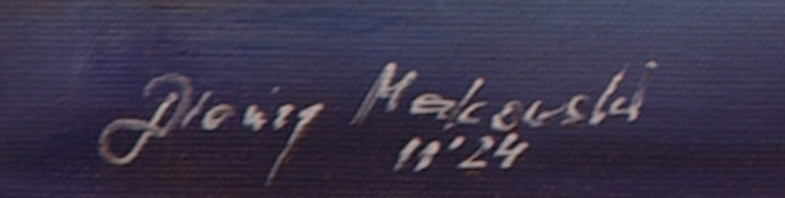 „Wspomnienie” to nie tylko obraz, to wizualna podróż do świata wewnętrznych przeżyć. Zastosowana technika olejna pozwoliła mi na stworzenie dzieła o bogatej fakturze i delikatnych, przenikających się warstwach koloru. Kompozycja przedstawia prawdopodobnie jesienny lub wczesnozimowy pejzaż z linią drzew na horyzoncie, które wydają się być zamglone lub spowite delikatną mgłą. Dominują stonowane barwy – odcienie szarości, błękitu i delikatnego fioletu w tle, które tworzą eteryczną, niemal oniryczną atmosferę. Na pierwszym planie widoczne są bardziej zgaszone zielenie i brązy, sugerujące roślinność lub ziemię. Światło, choć stłumione, delikatnie rozświetla niebo, nadając scenie poczucie spokoju i intymności. Każde pociągnięcie pędzla, choć swobodne, jest precyzyjnie przemyślane, a technika impasto dodaje dziełu głębi i ekspresji. Obraz jest wykończony specjalnym werniksem, który chroni kolory przed blaknięciem i nadaje im subtelny, satynowy blask, podnoszący jego estetyczną wartość.